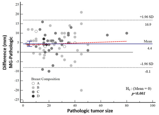 According to Bland–Altman plot analysis, the mean difference in mammographic tumor size from pathological size was 4.43 mm [95% CI: 3.01–5.83] and the mean difference in MRI-measured size was 3.03 mm [95% CI: 2.12–3.95], both of which were statistically significantly higher (both p < 0.001) (Table 3, Figure 5). Although a cut-off value could not be calculated statistically, it was noticeable in the graphs that the difference in the pathological size increased as the tumor size increased.
