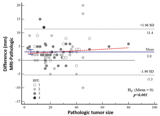Bland–Altman plot showing the distribution of the difference between the magnetic resonance imaging and pathological sizes according to background contrast enhancement.