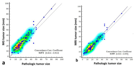 Scatter dot plots showing the correlation of pathologically measured tumor size with mammography- and magnetic resonance imaging (MRI)-measured size. The correlation coefficient of concordance is poor between mammography and pathology (a), and the scatterplots indicate that there may be deviations, especially in certain size ranges. Between MRI and pathology (b), it is moderate, indicating that MRI provides a reliable estimate of tumor size, especially in the 0–80 mm range.