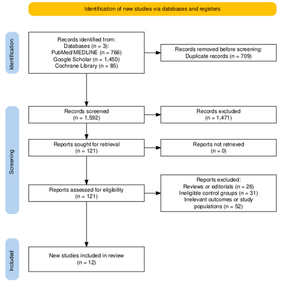 A total of 2301 records were retrieved from various databases. Following the removal of 709 duplicates, 1592 unique records remained for title and abstract screening. Of these, 1471 were excluded, and the full texts of 121 articles were retrieved for screening. After full-text review, 12 studies met the inclusion criteria [10,11,21,22,23,24,25,26,27,28,29,30]. The PRISMA flowchart (Figure 1) summarizes the screening and study selection process.