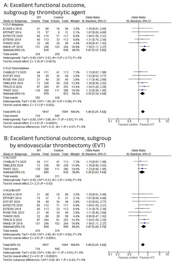 When stratified by EVT status, IVT was associated with a significantly higher rate of excellent outcomes in both the EVT (OR: 1.30; 95% CI: 1.03 to 1.64; I2 = 0%; p = 0.03) and non-EVT groups (OR: 1.47; 95% CI: 1.22 to 1.78; I2 = 0%; p < 0.0001), with no significant difference between subgroups (p = 0.42, Figure 2B).