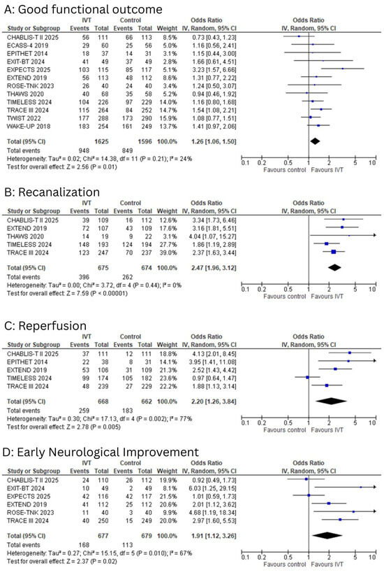 Six studies reported the outcome of early neurological improvement. A significant association was observed between IVT and improved early neurological outcomes compared to controls (OR: 1.91, 95% CI: 1.12–3.26, I2 = 67%, p = 0.02, Figure 3D). Moderate heterogeneity was detected among the included studies (I2 = 67%).