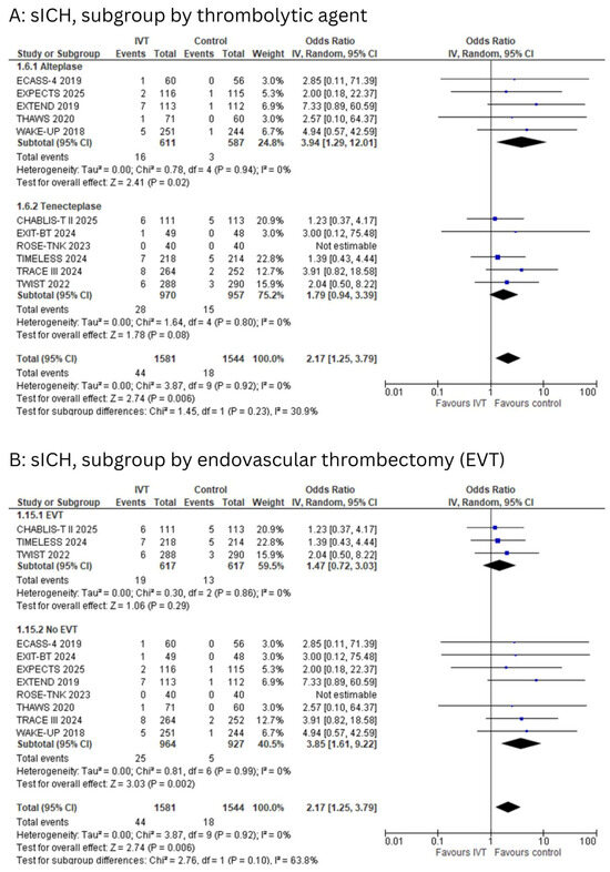 When stratified by EVT status, IVT was associated with a significantly higher risk of sICH in the non-EVT group (OR: 3.85; 95% CI: 1.61 to 9.22; I2 = 0%; p = 0.002), whereas the association was not statistically significant in the EVT group (OR: 1.47; 95% CI: 0.72 to 3.03; I2 = 0%; p = 0.29), with no significant difference between subgroups (p = 0.10, Figure 4B).