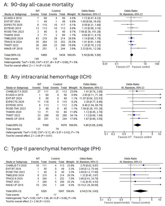 (A): Forest plot for 90-day all-cause mortality. (B): Forest plot for any intracranial hemorrhage (ICH). (C): Forest plot for type-II parenchymal hemorrhage (PH).