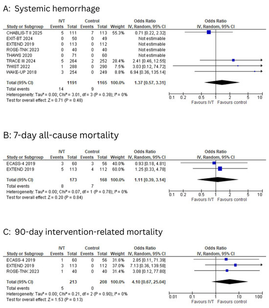 Eight studies reported the outcome of systemic hemorrhage. The pooled analysis demonstrated no statistically significant difference in systemic hemorrhage between patients who received IVT and those in the control group (OR: 1.37; 95% CI: 0.57 to 3.31; I2 = 0%; p = 0.48, Figure 6A).