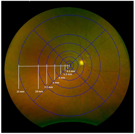 Inspired by the ETDRS grid, we designed this “INSPIRED” grid using Optos’ proprietary tool. It consists of seven fovea-centered concentric circles and four radial lines dividing the retina into zones and subfields (Figure 1). The innermost circle, centered on the fovea, has a radius of 0.5 mm, defining the central subfield and covering approximately 0.785 mm2. Subsequent circles extend to radii of 1.5 mm (7.10 mm2), 3 mm (28.22 mm2), 5 mm (76.88 mm2), 7.5 mm (170.00 mm2), 10 mm (300.00 mm2), and 15 mm (620.00 mm2). The grid is divided into four quadrants (superior, inferior, nasal, and temporal) by two perpendicular lines that intersect at the fovea, creating a total of 25 subfields (with the central circle counting as one subfield). All measurements were performed using Optos’ proprietary tool, which applied trigonometry to adjust the area difference between the flattened image on the screen and the actual retinal areas in the eyes [19].