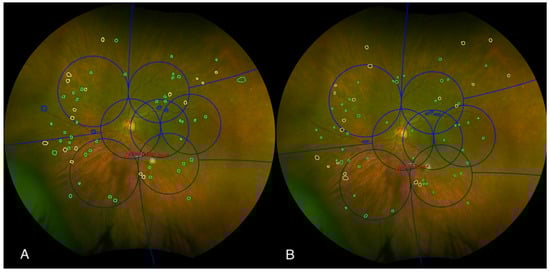 An example of two graders’ assessments of diabetic retinopathy characteristics (A,B) to determine whether the lesion is predominantly peripheral or predominantly central. Color fundus photograph of the left eye, graded independently by two masked graders using the Early Treatment Diabetic Retinopathy Study (ETDRS) grid (blue grid). The image illustrates the assessment of predominantly central lesions (PCL) within the ETDRS grid. Graders identified and delineated specific retinal lesions, including microaneurysms (marked with green circles), hemorrhages (marked with yellow circles), and venous beading (marked with blue circles). Additionally, intraretinal microvascular abnormalities (IRMA) were outlined in red, and the area of IRMA was quantified.