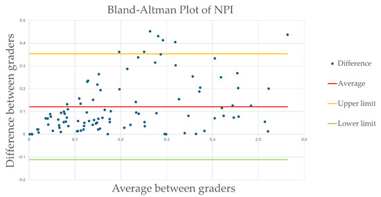 Agreement between the two teams was further assessed using a Bland–Altman plot (Figure 3). The mean NPI difference between the graders’ measurements was 0.12, ranging from −0.11 to 0.35, and 7% of outliers (7/100), indicating an acceptable variability despite a few outliers.
