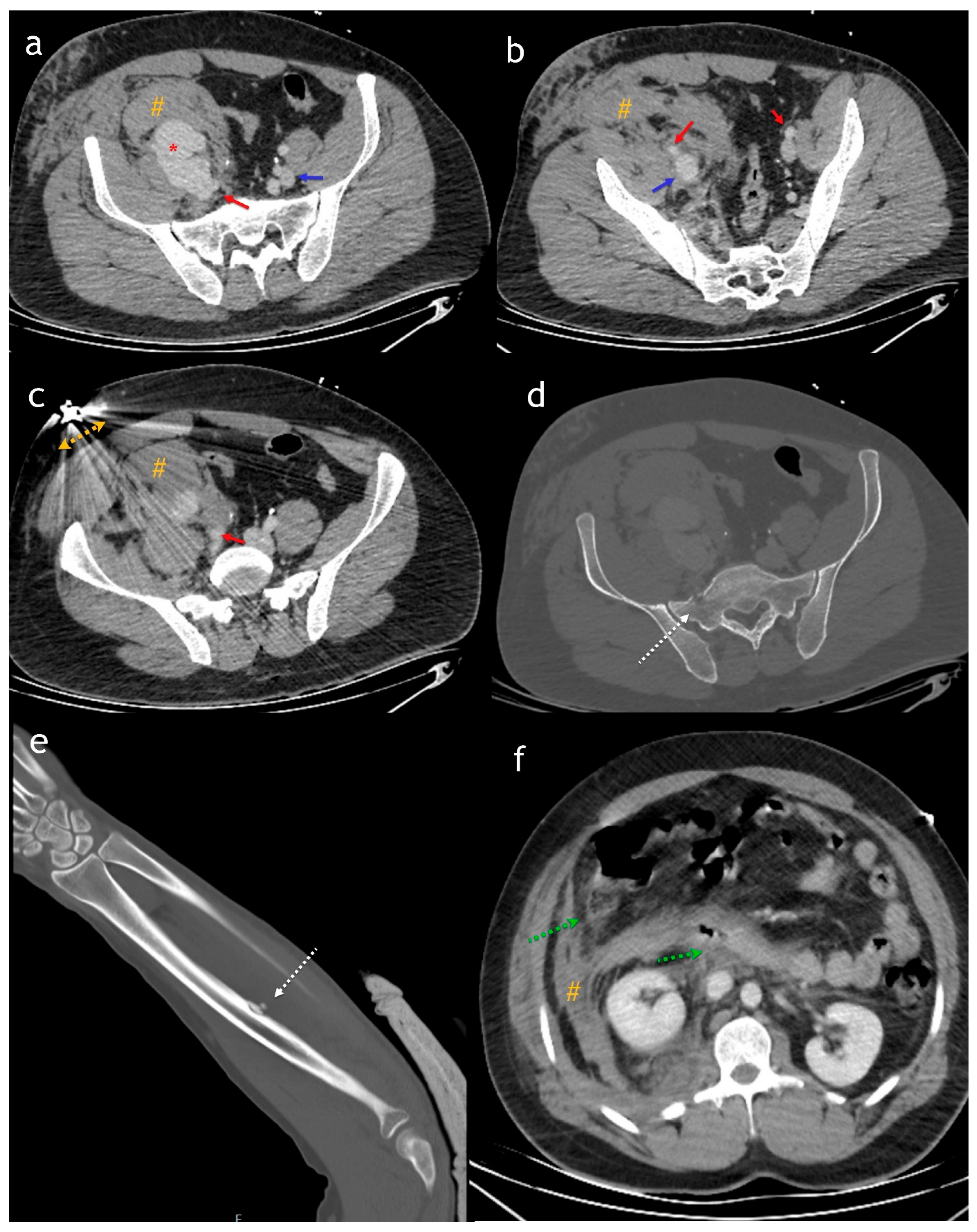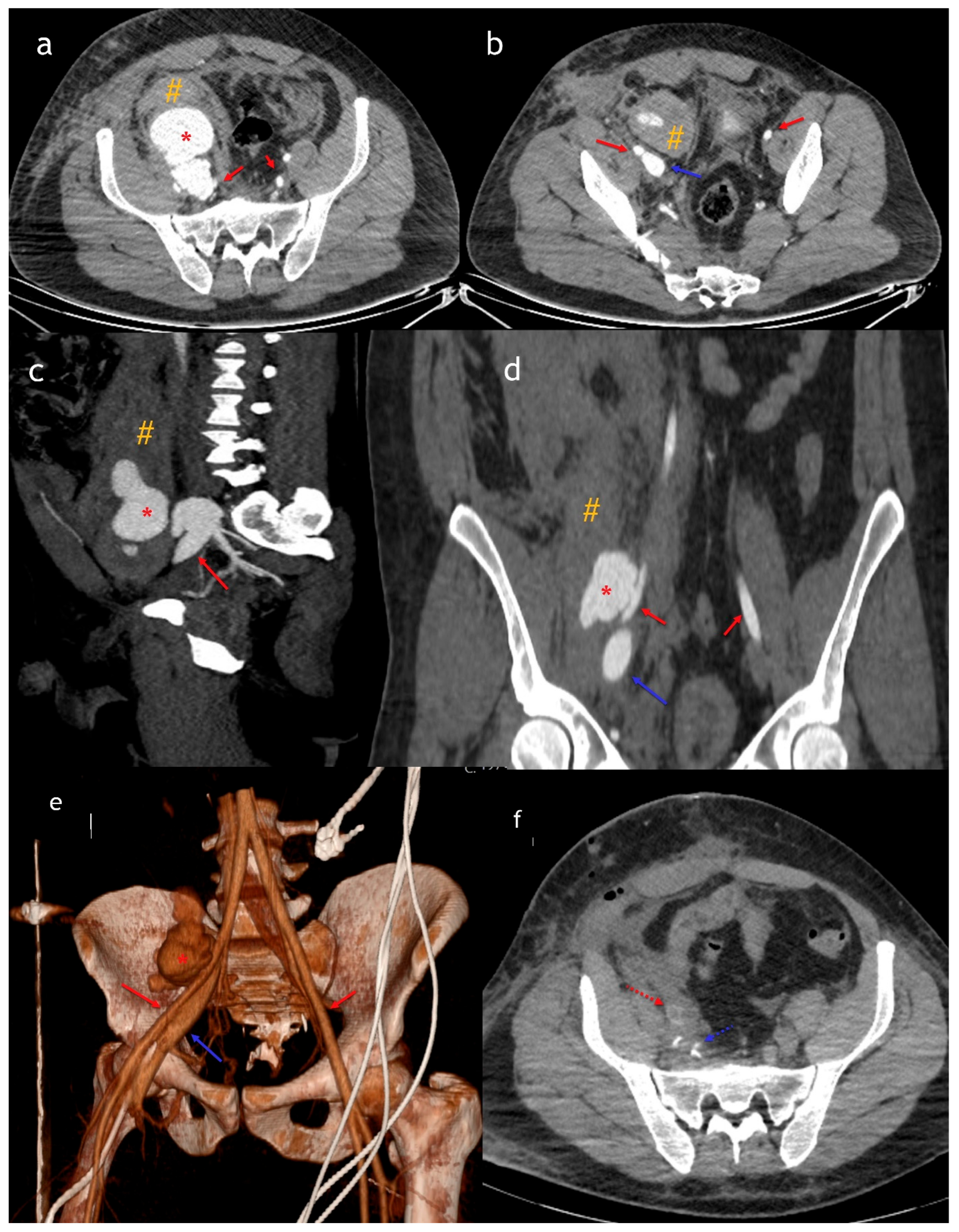 - Benbrahim, F.Z.; Ankri, M.; Fariyou, A.; El Aoufir, O.; Laamrani, F.Z.; Laila, J. Spontaneous ilio-iliac arteriovenous fistula: A rare complication of aorto-iliac aneurysm. Radiol. Case Rep. 2024, 19, 2996–3000. [Google Scholar] [CrossRef]