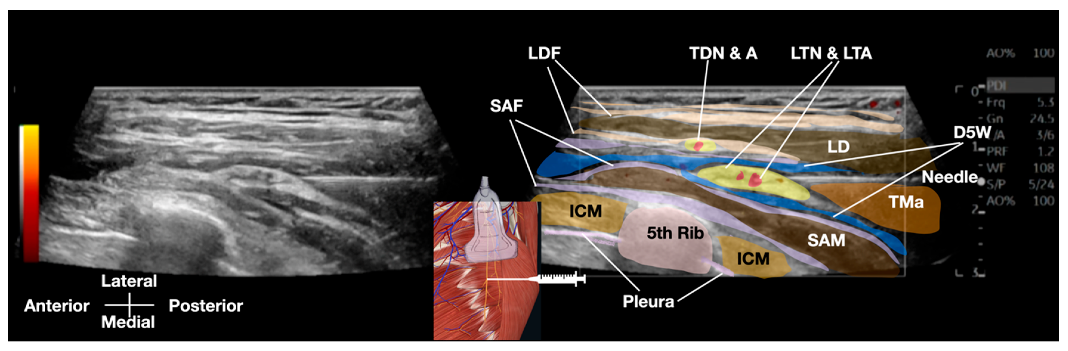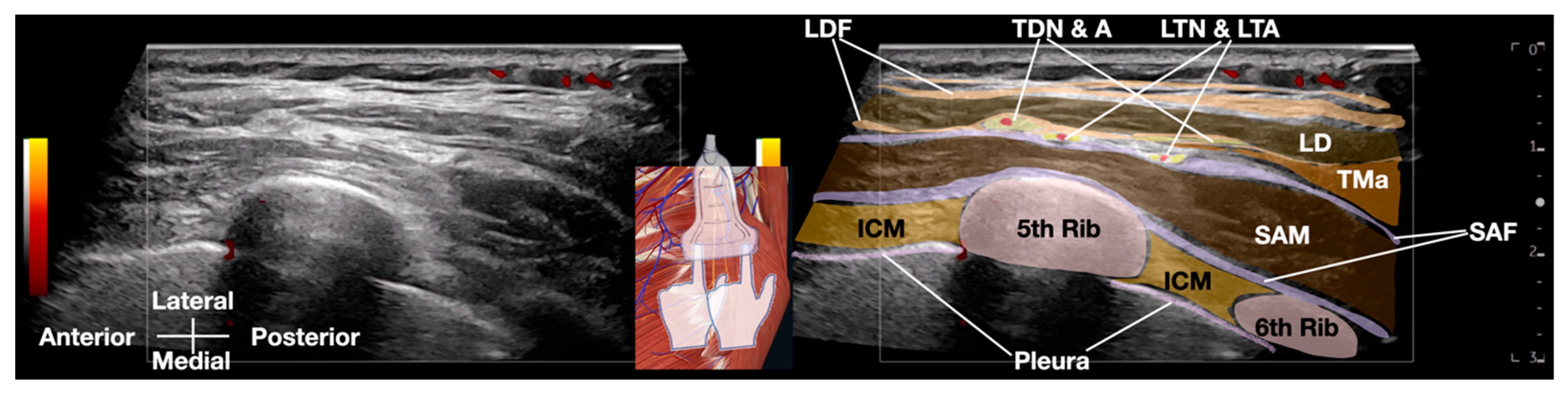 - Kim, M.; Goh, D.; Cho, S.; Noh, Y.; Hwang, B. Serratus anterior plane block with ultrasound-guided hydrodissection for lateral thoracic pain caused by long thoracic nerve neuropathy—A case report. Anesth. Pain Med. 2022, 17, 434–438. [Google Scholar] [CrossRef]