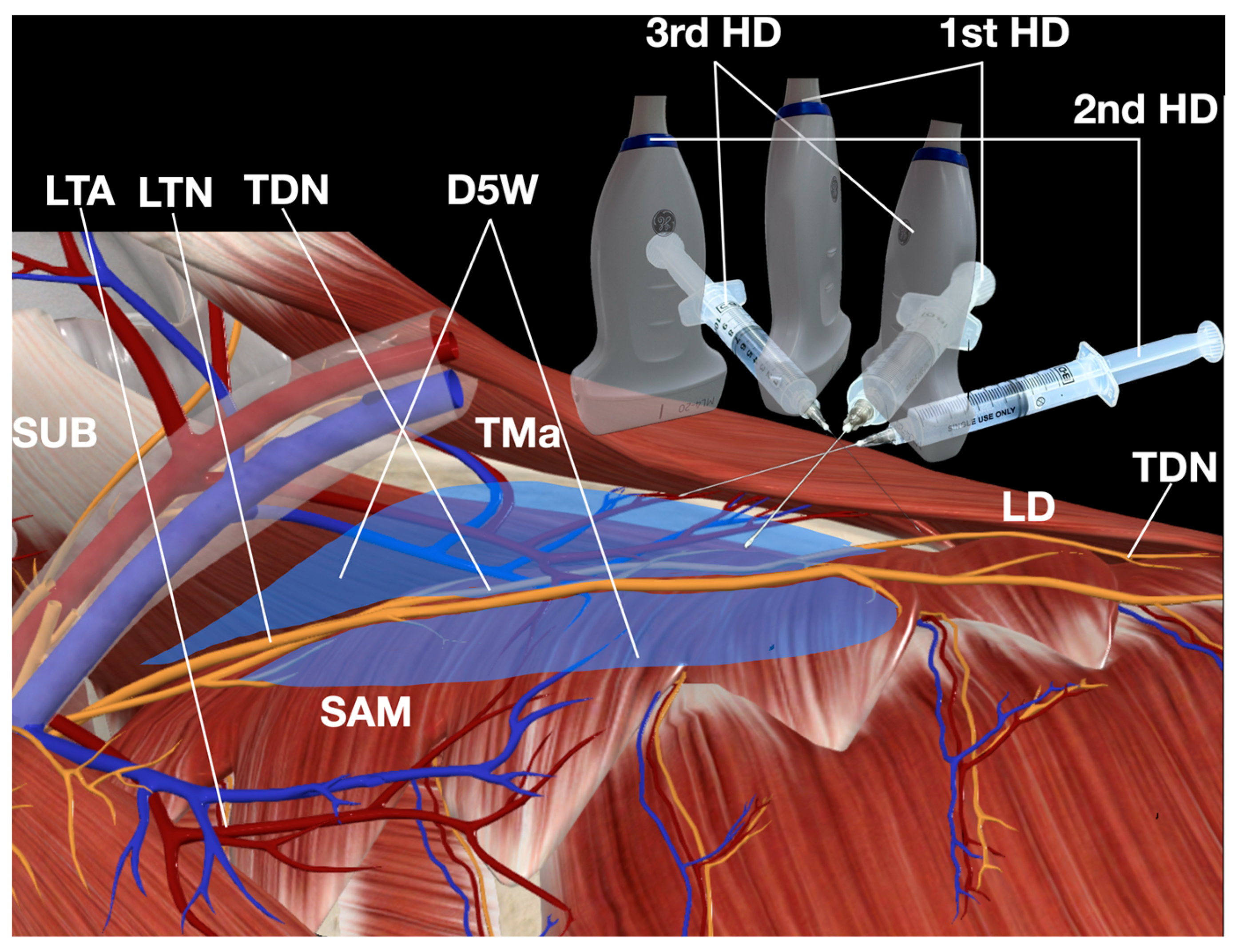 Volume/Extent | 2 mL of Bupivacaine 0.25% and Triamcinolone 4 mg/mL to each trigger points, total volume not mentioned | 20 mL of bupivacaine 0.125% with 20 mg Triamcinolone in the plane between the serratus anterior and latissimus dorsi | 20–30 mL D5W without LA (circumferential to the LTN and the fascial plane between the serratus anterior and latissiumus dorsi) |