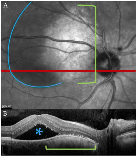 Infrared (IR) and optical coherence tomography (OCT) image of the choroidal nevus and associated subretinal fluid (SRF). (A). The choroidal nevus is visualized as a hyperreflective whiteish lesion in the IR image, and the length of the nevus is demonstrated by the green brackets. SRF is located temporal to the nevus and appears dark on the IR image. The edge of the SRF is outlined in blue. (B). The OCT b-scan (location corresponds to red line in (A)) demonstrates SRF at the macula (blue asterisk), and the hyper-reflective nevus is visible under the RPE in the choroid (green bracket).