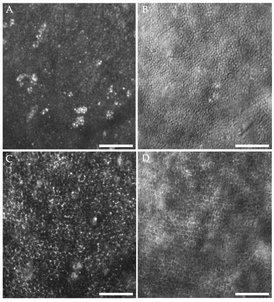 AOSLO images focused on photoreceptors (A,B) and RPE (C,D) in the same retinal location within an area of foveal subretinal fluid (SRF) due to the choroidal nevus. The pairs of (A,B) and (C,D) were each captured simultaneously using the confocal (A,C) and multiply scattered light channels (B,D). Note that in (B), the photoreceptor inner segment mosaic appears as expected, whereas only clusters of photoreceptors are visualized in (A) likely due to the presence of SRF altering the photoreceptors’ waveguiding ability. In both (C,D), the hexagonal RPE mosaic is seen in the presence of SRF. Image contrast was increased for visibility. A subset of the multiply scattered light data (B,D) has also been presented in Burns et al. []. Scale bars = 100 μm.