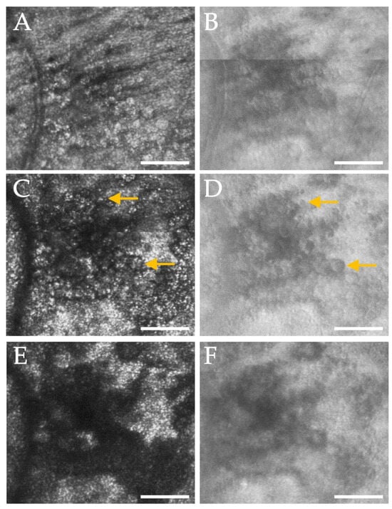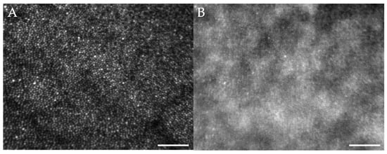 A 3 × 3-degree parafoveal region of the cone mosaic visualized with confocal (A) and non-confocal (B) light in the control subject. In (B), a spatial light modulator was used to capture the non-confocal image and the RPE hexagonal array can be visualized though much less distinctly than when subretinal fluid is present (compare Figure 2C,D). Scale bars = 50 µm.