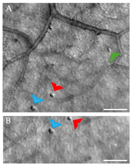 Example of cell-like structures over time in the control participant, superior nasal to the foveal avascular zone border. (A). Arrowheads (red, blue, and green) point to cell-like structures. (B). Two of the cell-like structures (red and blue arrowheads) are still visible at the same location one month later, exhibiting the same size and morphology. Scale bars = 50 µm.