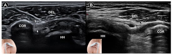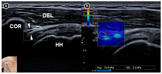 Shear wave sonoelastography of the coracohumeral ligament (white arrowheads) shown in grayscale imaging (A) and color elastogram (B). The figure was redrawn by the authors with reference to Wu et al. []. DEL, deltoid muscle; COR, coracoid process; HH, humeral head.