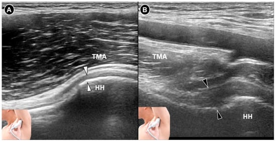 Ultrasound imaging of the inferior glenohumeral joint (white arrowheads) in a normal shoulder (A). In contrast, imaging of the inferior glenohumeral ligament (black arrowheads) in a shoulder with adhesive capsulitis reveals thickening of the inferior glenohumeral capsule (B). HH, humeral head; TMA, teres major.