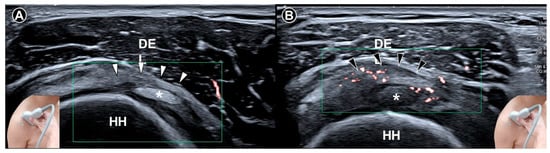 Ultrasound imaging of the rotator cuff interval (white arrowheads) in a normal shoulder (A). In contrast, the coracohumeral ligament (black arrowheads) in a shoulder with adhesive capsulitis exhibits increased vascularity (B). DEL, deltoid muscle; HH, humeral head; asterisks, long head tendon of the biceps brachii.