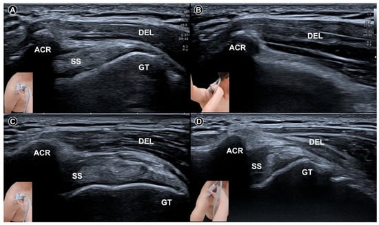 Dynamic ultrasound has been widely explored for its diagnostic potential in evaluating adhesive capsulitis, particularly due to its ability to capture movement limitations in real time []. Ryu and colleagues [] focused on identifying restricted sliding of the supraspinatus tendon beneath the acromion during shoulder elevation (Figure 4). During the examination, the sonographer stabilized the patient’s elbow and used a longitudinal transducer placement over the supraspinatus tendon to visualize its motion as the arm was abducted. Two key sonographic findings were proposed as indicators of adhesive capsulitis: (1) persistent restriction of the tendon’s gliding motion and (2) uninterrupted visualization of the supraspinatus tendon throughout arm elevation (Video S1, normal shoulder; Video S2, adhesive capsulitis). The diagnostic performance of these ultrasound findings was validated against arthrography, which served as the reference standard. Among the 23 patients with arthrographically confirmed adhesive capsulitis, 21 demonstrated the sonographic criteria of adhesive capsulitis, resulting in a sensitivity of 91%, specificity of 100%, and overall diagnostic accuracy of 92%. These findings underscore the value of dynamic ultrasound in detecting functional limitations associated with adhesive capsulitis, particularly involving the supraspinatus tendon. However, it should be noted that the study did not include a dedicated control group. All enrolled subjects were clinically suspected of having frozen shoulders, and the specificity values were based only on those not meeting the arthrographic criteria. This limits the generalizability of the findings, as the proposed ultrasound features may not be entirely specific to adhesive capsulitis and could potentially be observed in other shoulder pathologies. This limitation should be taken into account when interpreting the diagnostic utility of dynamic ultrasound in clinical practice.