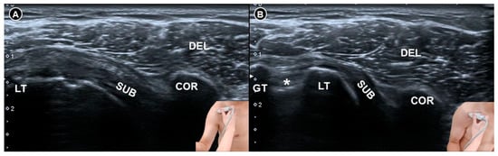 Dynamic ultrasound imaging of the subcoracoid region during shoulder external rotation. In a normal shoulder (A), the subscapularis tendon is fully visualized whereas in a shoulder with adhesive capsulitis (B), only the distal portion of the tendon is visible and appears hypoechoic due to anisotropy, as the tendon fibers are not perpendicular to the ultrasound beam. The figure was redrawn by the authors with reference to Tandon et al. []. DEL, deltoid muscle; COR, coracoid process; SUB, subscapularis tendon; LT, lesser tubercle; GT, greater tubercle; asterisk, long head tendon of the biceps brachii.