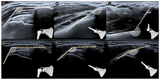Dynamic ultrasound images of a normal shoulder captured at neutral resting position (A), during abduction beyond 90 degrees (B), and at full elevation to 180 degrees (C). Corresponding images of a shoulder with adhesive capsulitis at rest (D), abduction past 90 degrees (E), and maximal abduction (F). The figure was redrawn by the authors with reference to Chang et al. [].