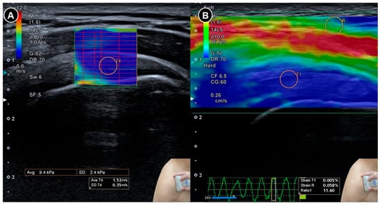 Sonoelastography of the supraspinatus tendon. Shear wave elastography (A) demonstrates the shear wave speed and strain elastography (B) illustrates the strain ratio. The figure was redrawn by the authors with reference to Yun et al. [].