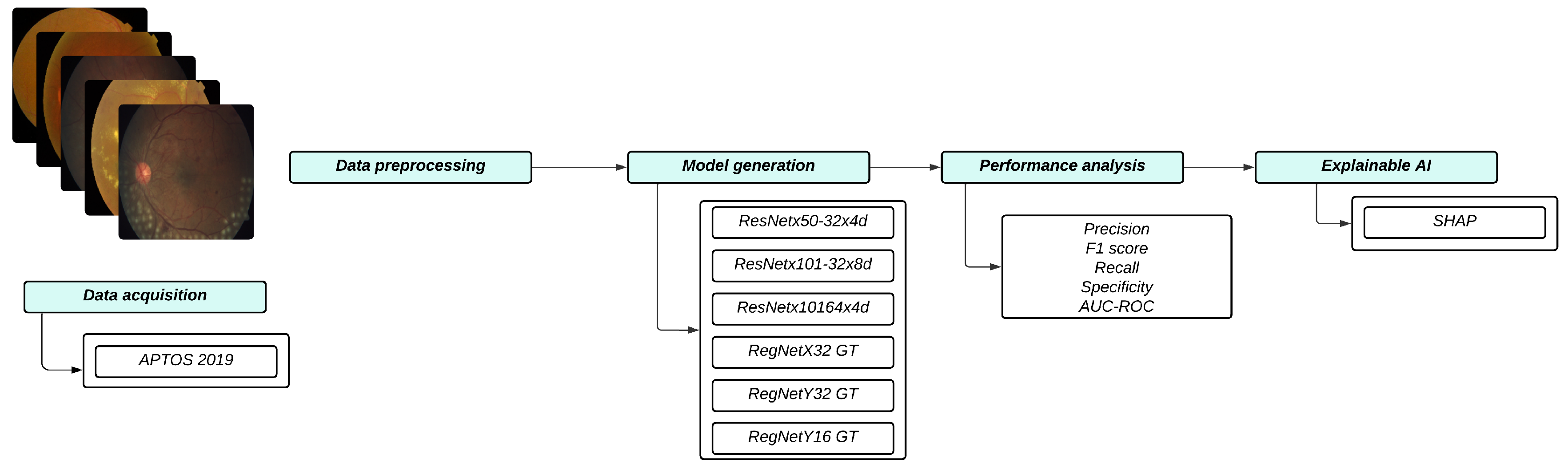 21] evaluated the performance of multiple DL architectures for DR classification, including DenseNet, InceptionV3, MobileNetV3, ResNet50, VGG, and Xception. They also integrated SHAP to improve model interpretability. The ResNet50 model was modified through additional regularization techniques, fine-tuning, and TL to optimize its ability to distinguish DR severity levels and enhance generalizability across datasets. The models were trained and evaluated using five publicly available retinal image datasets: APTOS 2019 [