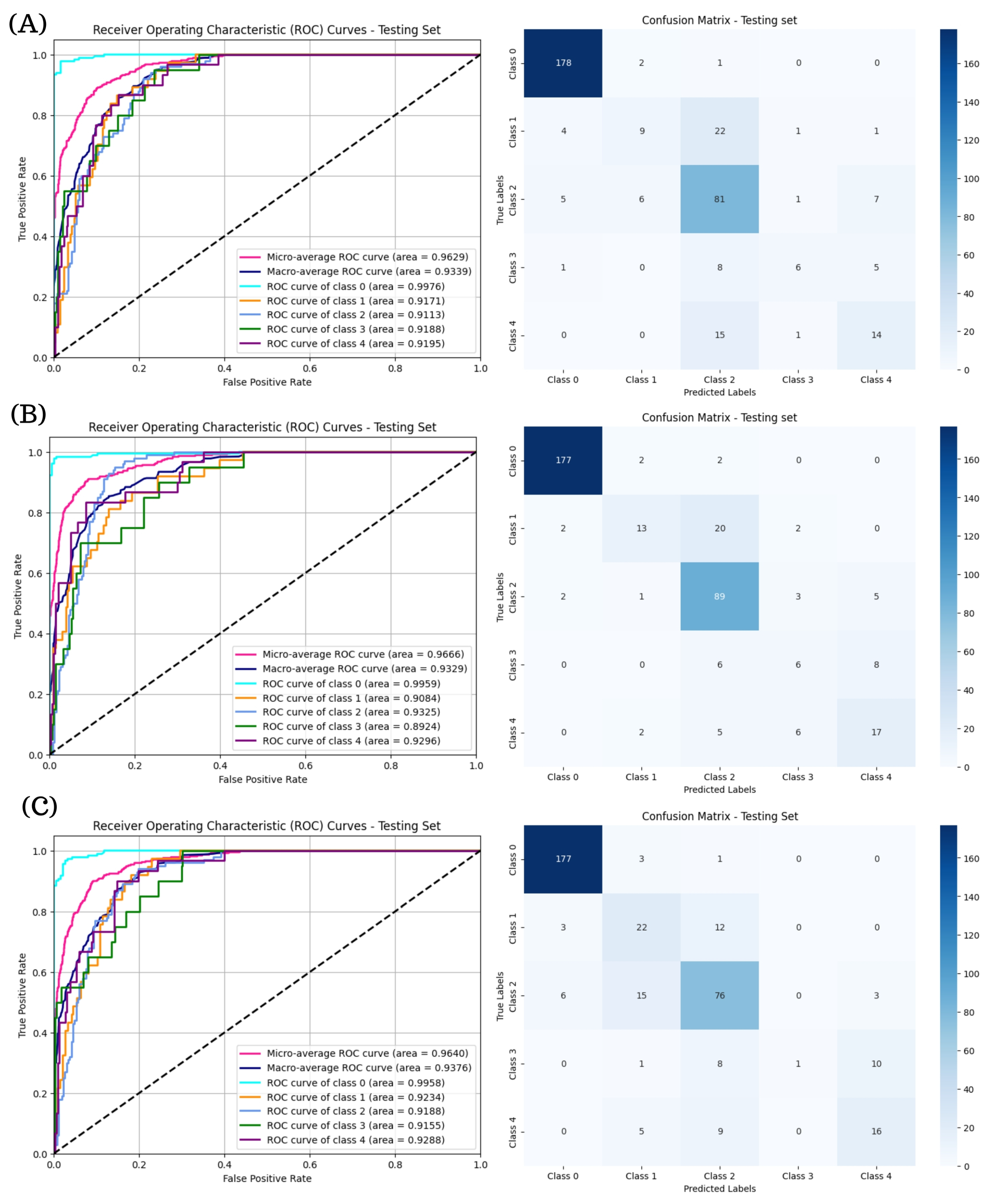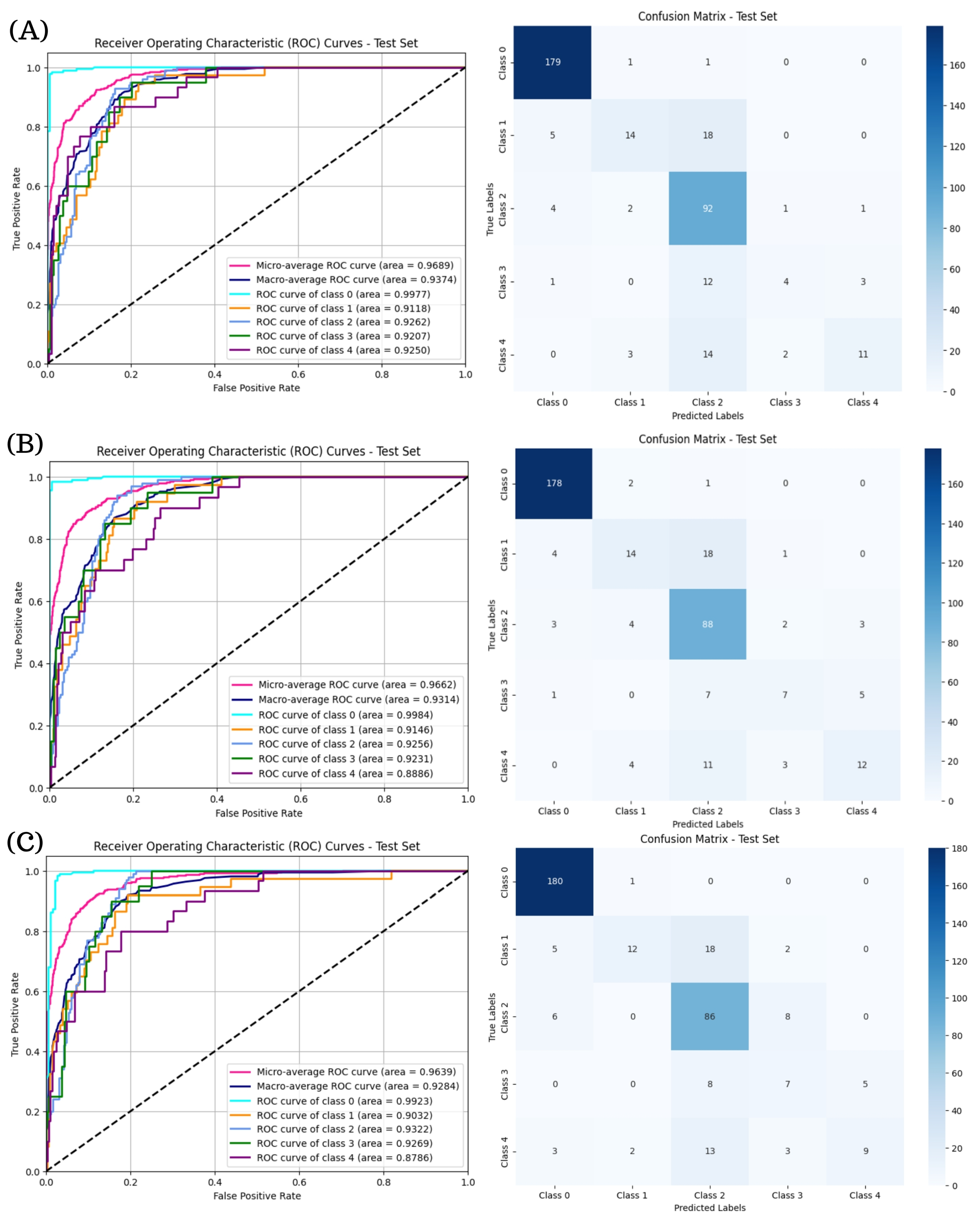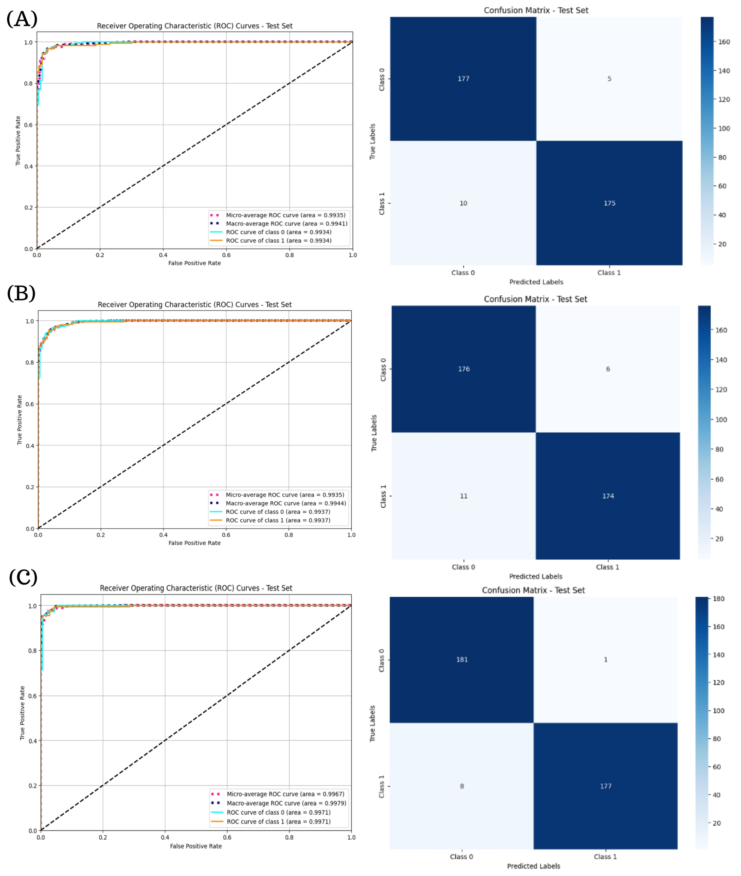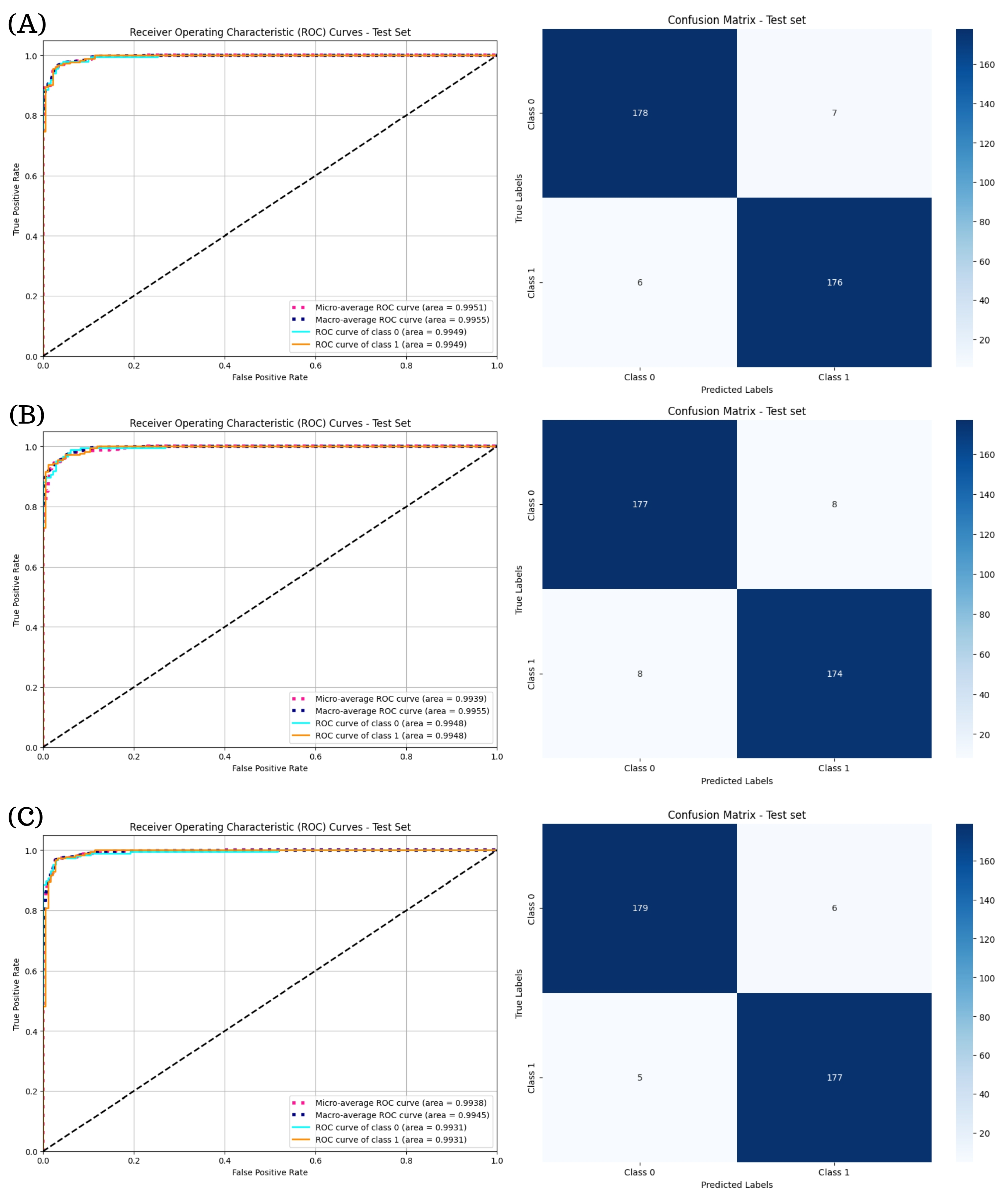 Figure 5A,B) also maintained high performance, with macro-average AUCs above 0.994 and minimal false predictions, particularly in Class 1.
