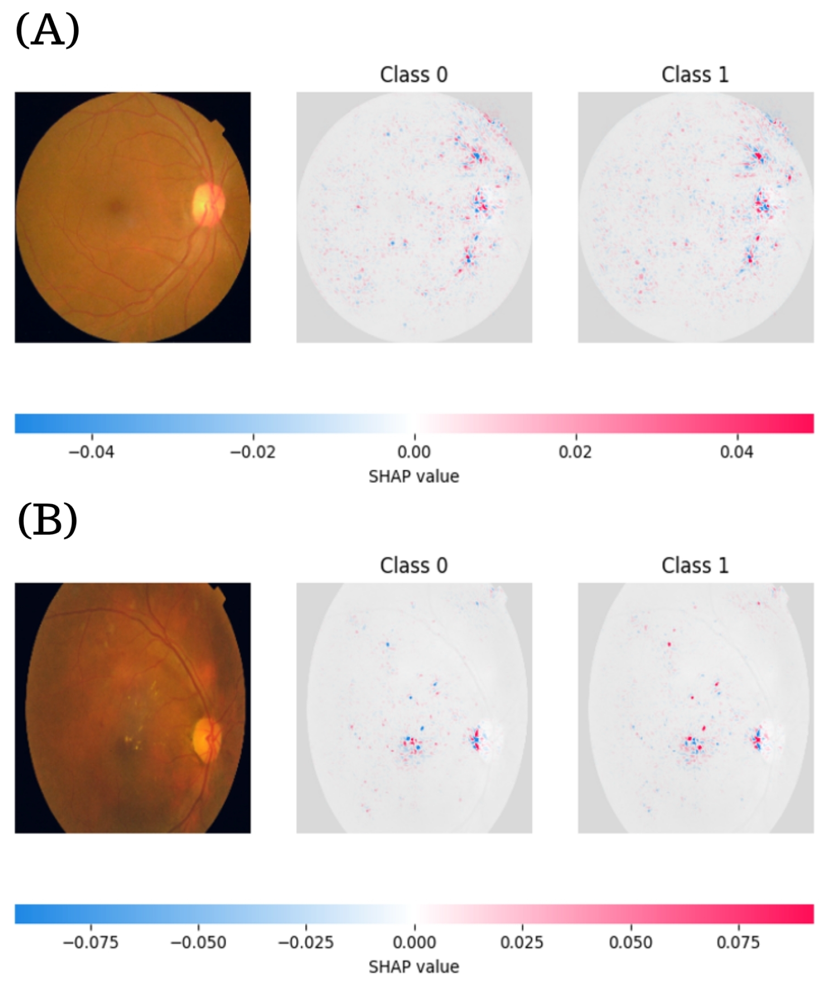 In contrast, the DR-positive case (B) exposes pathological signs such as scattered hard exudates and vascular abnormalities. Here, the SHAP values range from −0.04 to 0.04, indicating a more localized and nuanced 1interpretive scope. In the Class 0 map, negative contributions are more diffusely distributed, signaling that various retinal regions challenge the classification as healthy. Class 1 shows concentrated red zones, particularly near the macula and along primary vascular paths. These areas correspond to lesions typical of DR. Notably, the Class 1 SHAP map reveals more focal and lesion-specific activation compared to Class 0, reinforcing the model’s ability to isolate clinically meaningful features while discounting noise.