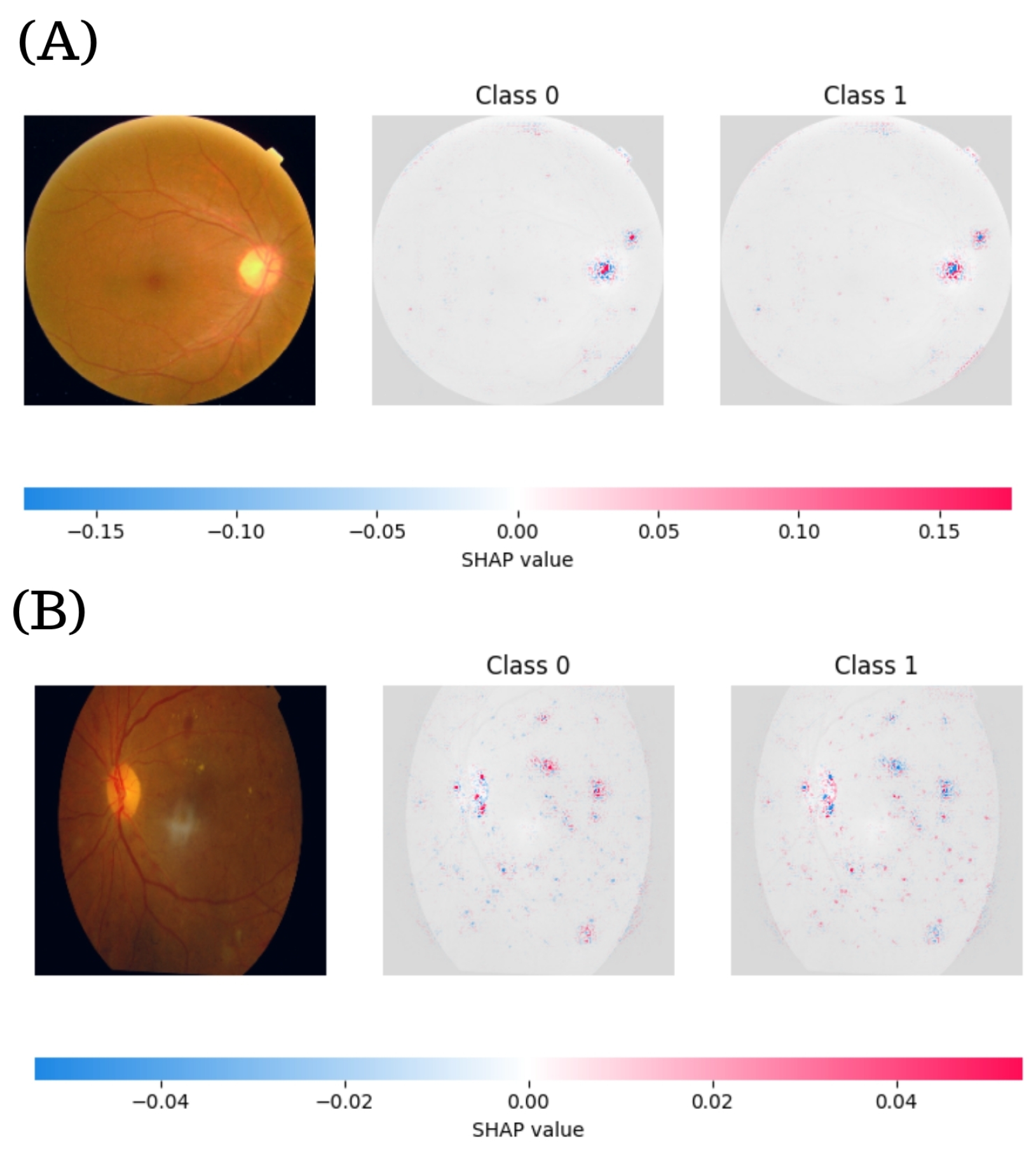 Figure 8B). Each subfigure comprises the original fundus image followed by SHAP heatmaps corresponding to Class 0 and Class 1 predictions.