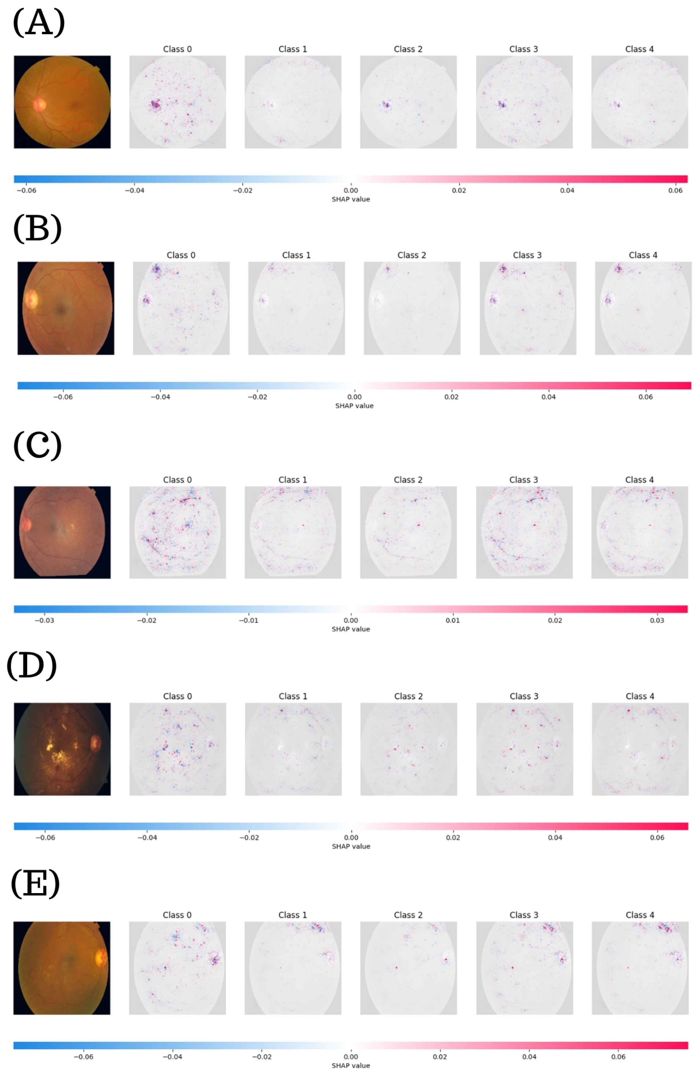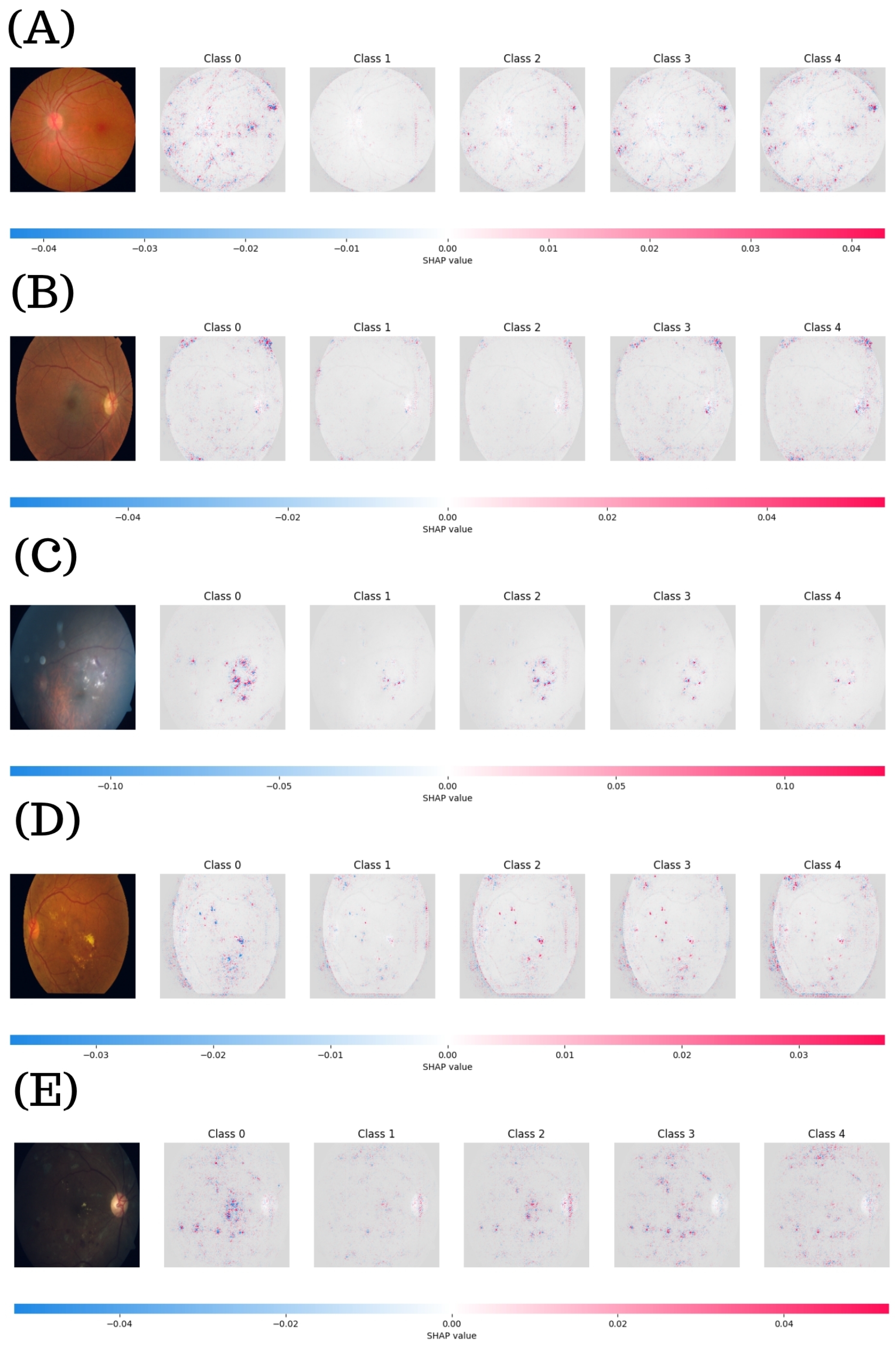 For case D (Class 3), the image shows well-defined exudates and vascular irregularities. The SHAP maps confirm these pathological markers, with intense activations in Class 3 and Class 4. These lesions are consistently highlighted in red across both classes, supporting the model’s attribution of these features to advanced DR. The pronounced contrast between Classes 0–2 and Classes 3–4 reflects a more binary interpretation of DR progression at this stage. Finally, case E (Class 4) details widespread retinal damage; SHAP maps exhibit dense regions in Class 3 and Class 4, particularly near hemorrhagic sites and neovascular formations. This distribution confirms that the model focuses on clinically significant abnormalities to justify its severe classification. Additionally, the lack of red activations in Classes 0-2 reinforces the model’s capacity to discount irrelevant features in advanced cases.