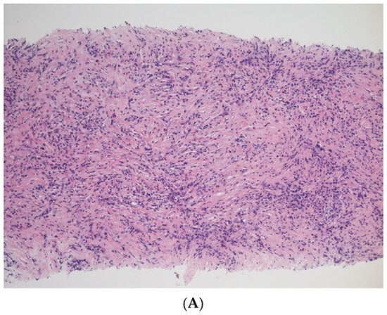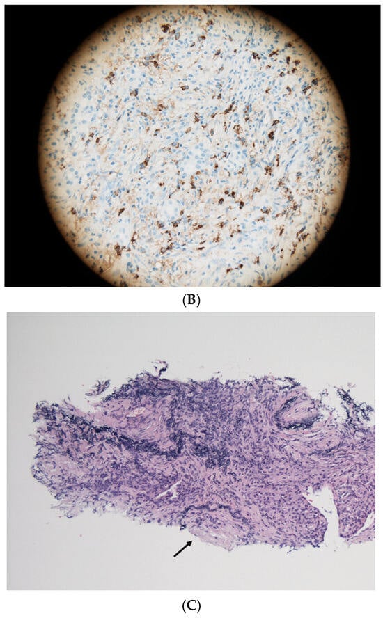Bile duct biopsy is performed to obtain histological evidence in indeterminate biliary strictures, particularly to exclude malignancy. Diagnostic features of IgG4-SC according to IgG4-SC2020 include lymphoplasmacytic infiltration, fibrosis, >10 IgG4-positive plasma cells per HPF, storiform fibrosis, and obliterative phlebitis [6]. However, the sensitivity of bile duct biopsy for detecting these features considerably varies (0–88%) [60,68,73,74]. In a nationwide Japanese survey (46), the rates of these histological features among bile duct biopsy samples were 32.9%, 16.9%, 0.6%, and 0.0%, respectively. The low sensitivity arises from the characteristic pathology: the bile duct epithelium is often normal, whereas diagnostic infiltration occurs in the subepithelial stroma, an area difficult to sample with small forceps.