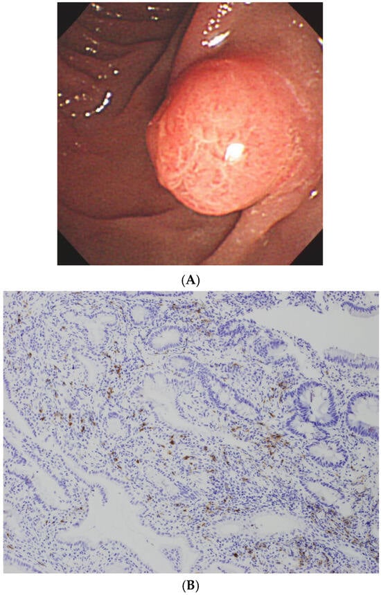 Swollen duodenal papillae and abundant IgG4-positive plasma cells in biopsy specimens are observed particularly in cases with pancreatic head involvement (Figure 4). The international consensus diagnostic criteria include duodenal papilla biopsy as an optional diagnostic approach [15]. We previously reported that duodenal papilla biopsy was the most useful method for diagnosing AIP among comprehensive immunostaining evaluations conducted across eight different organs [53]. Furthermore, pancreatic head involvement, intrapancreatic IgG4-SC, and duodenal papilla swelling were significantly associated with positive IgG4 immunostaining in duodenal papilla samples. Pathological analysis of duodenal papilla biopsy specimens with IgG4 immunostaining serves as a valuable supplemental tool in diagnosing AIP [53,54,55,56,57] and helps to differentiate it from other mimickers.