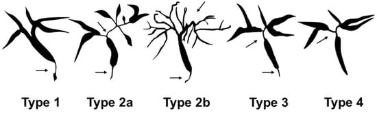 Cholangiographic classification of IgG4-related sclerosing cholangitis. Adapted with permission from Ref. [4]. 2012, John Wiley and Sons. Type 1. Stenosis is located only in the distal common bile duct. Type 2: Stenosis is diffusely distributed throughout the intrahepatic and extrahepatic bile ducts. Type 2a: Stricture of the intrahepatic bile ducts with prestenotic dilation. Type 2b: Stricture of the intrahepatic bile ducts without prestenotic dilation and reduced bile duct branches. Type 3: Stenosis is located in both the hilar hepatic and the distal common bile ducts. Type 4: Stenosis is located only in the hilar hepatic bile ducts. Arrows: Stenosis of the bile ducts.