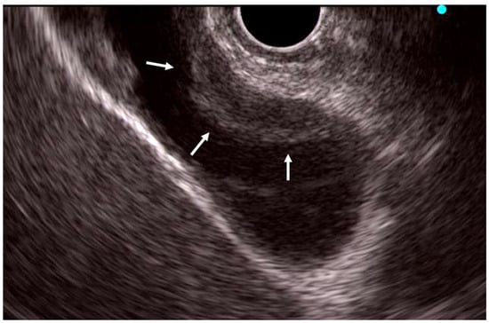 Endoscopic ultrasonographic findings showing a localized thickening of the gallbladder wall at the fundus, with the lesion located within the submucosal layer in localized IgG4-related cholecystitis (arrows).