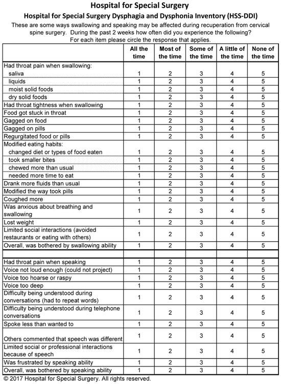 Hospital for Special Surgery Dysphagia and Dysphonia Inventory (HSS-DDI).