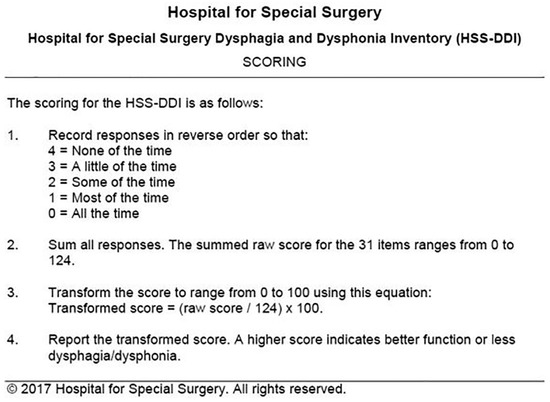 Scoring of the Hospital for Special Surgery Dysphagia and Dysphonia Inventory (HSS-DDI).