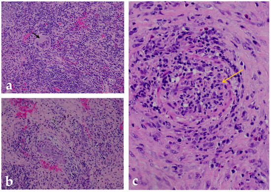 Histopathologic analysis of a GPA-associated cervical lesion. Hematoxylin and eosin (H&E)-stained sections from a biopsy of an ulcerative skin and subcutaneous lesion on the neck show the main histologic features of granulomatosis with polyangiitis (GPA): (a) A well-formed necrotizing granuloma embedded in a fibrotic stroma surrounded by a dense mixed inflammatory infiltrate composed predominantly of lymphocytes and neutrophils. In the center are multinucleated Langhans-type giant cells (black arrow), which are characteristic of GPA-related granulomatous inflammation. Magnification: 200×. (b) Perivascular inflammation involving small caliber vessels within fibrotic connective tissue. It shows segmental wall necrosis and a dense infiltrate of lymphocytes and neutrophils surrounding the affected vessels—findings consistent with chronic vasculitic changes. Magnification: 200×. (c) High magnification (400×) of a small- to medium-caliber arteriole with features of necrotizing vasculitis, including transmural infiltration of inflammatory cells (yellow arrow) and extensive fibrinoid necrosis of the vessel wall—hallmarks of active GPA.