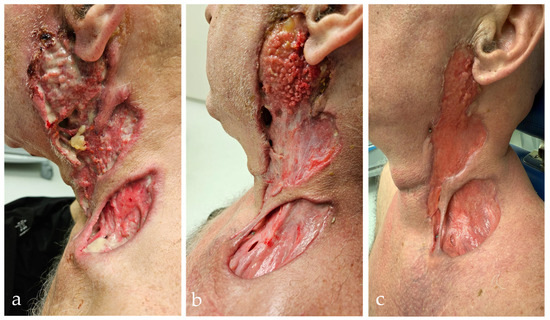 Worsening and response to therapy in PR3-ANCA-positive vasculitis during the third hospitalization. (a) Extensive ulcerative–necrotic lesions on the left side of the neck with infiltration of the parotid gland region. The lesions involve deep layers of subcutaneous and muscle tissue with clear signs of inflammation. (b) Partial improvement after systemic corticosteroid therapy, with visible granulation tissue, reduced necrosis, and early re-epithelialization. (c) Further epithelialization and regression of inflammation after three weekly doses of subcutaneous methotrexate and daily oral methylprednisolone.