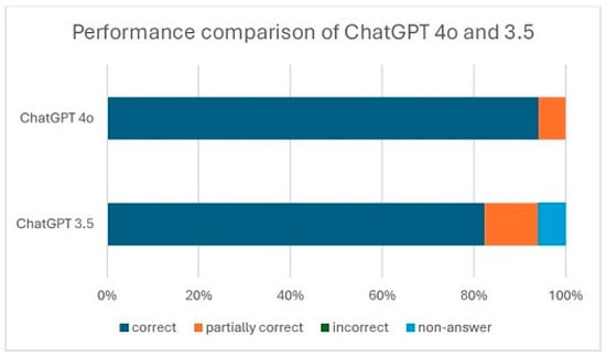- Wang, S.; Mo, C.; Chen, Y.; Dai, X.; Wang, H.; Shen, X. Exploring the Performance of ChatGPT-4 in the Taiwan Audiologist Qualification Examination: Preliminary Observational Study Highlighting the Potential of AI Chatbots in Hearing Care. JMIR Med. Educ. 2024, 10, e55595. [Google Scholar] [CrossRef] [PubMed]
