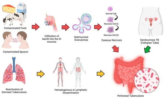 Figure 1. Pathogenesis of Peritoneal Tuberculosis. In the majority of cases, the bacteria propagate through the reactivation of tuberculosis in the lungs and disseminate to the peritoneum via the bloodstream or lymphatic system (yellow arrow). While less common, peritoneal infection can also occur via the gastrointestinal tract when individuals ingest contaminated sputum, unpasteurized milk, meats [5], and cheese [6]. The bacteria first infect the Peyer’s patches in the intestinal mucosa, and then spread to the mesenteric lymph nodes, where epithelioid tubercles form. Over the course of 2 to 4 weeks, caseous necrosis develops within these tubercles, leading to ulceration of the mucosal lining and potential infection of deeper intestinal layers. Eventually, the infection can spread to nearby lymph nodes and the peritoneum (red arrow). A rarer pathway of infection involves direct contamination of the peritoneum from a nearby infectious source, such as an abscess in the fallopian tubes [7] (green arrow).