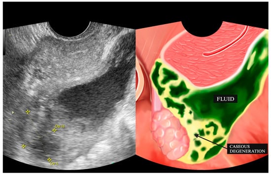 In seven out of 12 patients (58.3%), a hydrosalpinx appearance was noted, characterized by a mass with incomplete septa, containing caseous degeneration or complex fluid, as shown in Figure 6.