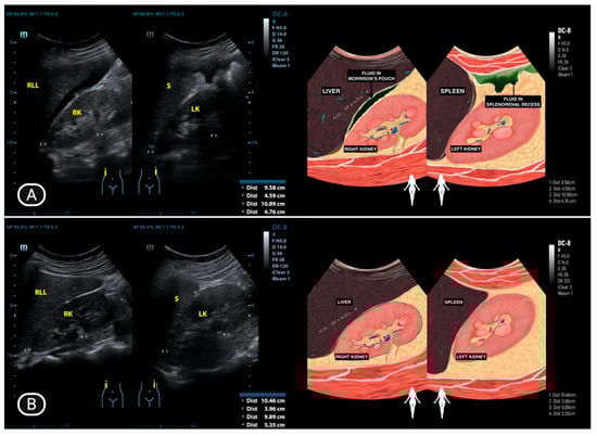 Figure 3. (A) Fluid accumulation in Morison’s pouch and splenorenal recess; (B) Fluid resolution after one month of anti-tuberculosis drug therapy.