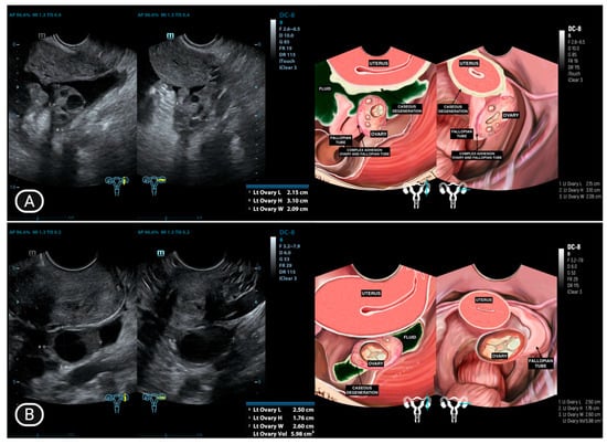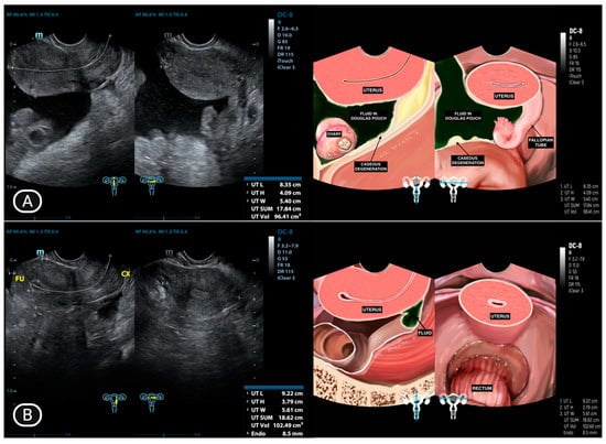 Figure 4. (A) Fluid accumulation in the Douglas pouch with caseous degeneration covering the uterus and rectosigmoid colon; (B) Significant reduction in fluid and caseous degeneration after one month of anti-tuberculosis drug therapy.
