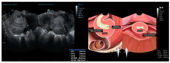In one patient (8.3%), the accumulation of caseous degeneration in the endometrium was observed, presenting a “fern-like pattern” and accompanied by thickening, as illustrated in Figure 7.