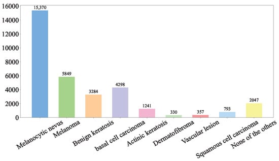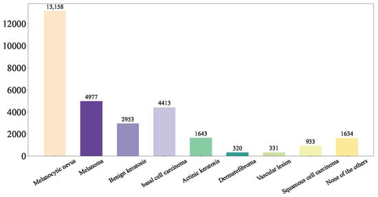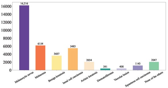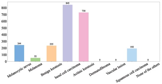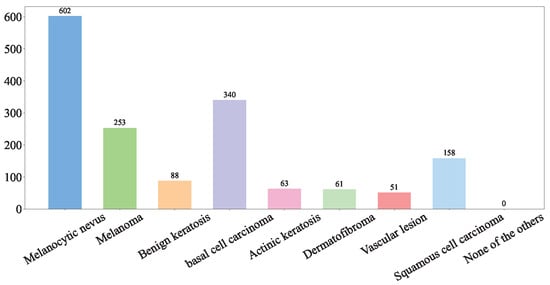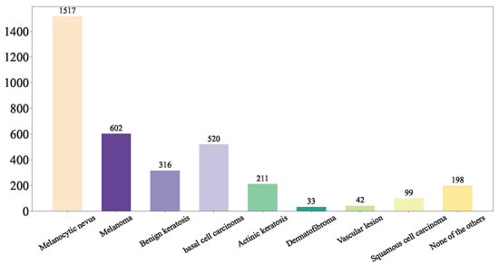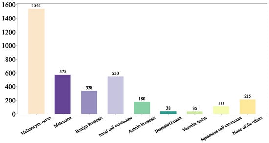 (2) Hospital Italiano de Buenos Aires Skin Lesions Images 2019–2022 (HIBA 2019–2022): The Hospital Italiano de Buenos Aires Skin Lesions Images 2019–2022 (HIBA 2019–2022) dataset [35] is sourced from institutional records spanning 2019 to 2022. It contains information on patients with common skin lesions who visited the Dermatology Department during this period, along with their corresponding clinical and dermoscopy images. Three expert dermatologists carefully selected the cases included in the dataset. Clinical images were captured using the smartphones of the attending professionals. Dermoscopy images were obtained through a variety of professional dermatoscope devices, including the VL-7EX II video microscope (Scalar Corporation, Tokyo, Japan), Dermagraphix Mirror 7 (Canfield Scientific, Parsippany, NJ, USA), FotoFinder-compatible cameras such as the Medicam 1000s and Medicam 800Hd, and dermoscopic attachments for smartphones. The class distribution of the skin lesions in HIBA 2019–2022 dataset is shown in Figure 2.