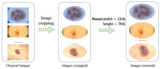 (1) Data Preprocessing: We meticulously crop each image in our integrated dataset (including training set, validation set and test set). We assign the skin background mucosa and noises irrelevant to lesions to . This step is essential to eliminate normal skin mucosa in the surrounding background and extraneous noise information, ensuring that the pathological skin lesions were centered within the images. To streamline the training and testing procedures, all images are standardized to a fixed resolution of (, ). This standardization is pivotal in enabling effective and consistent evaluation across different models and experiments. The preprocessing flow is depicted in Figure 8.