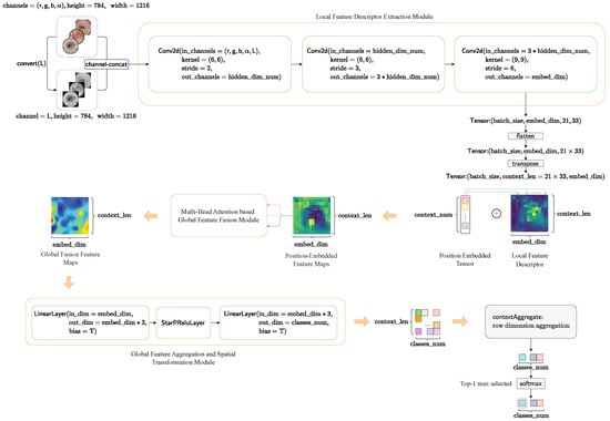 Then, we flatten and transpose the local feature matrix to obtain the feature context feature matrix. We use a learnable tensor to perform positional encoding on the context feature matrix. Next, we input the position-embedded context feature matrix into the global feature fusion module with a sequence of multi-layer multi- head attention feature fusion layer for. The output is a globally fused feature tensor.
