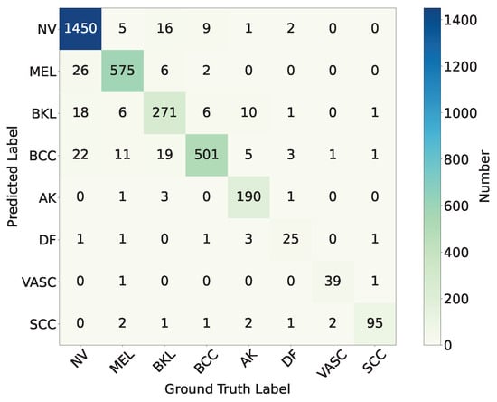 (1) ISIC Challenge 2019 Dataset: The ISIC 2019 dataset (https://challenge.isic-archive.com/data/#2019 (accessed on 8 August 2025)) is sourced from multiple international clinical centers and dermatological databases. The images are meticulously acquired using a diverse array of high-resolution dermatoscopes. In total, the dataset encompasses 33,569 skin lesion images. These images comprehensively depict a wide spectrum of skin conditions, including melanoma (MEL), basal cell carcinoma (BCC), and squamous cell carcinoma (SCC). The ISIC Challenge 2019 Dataset represents a comprehensive superset encompassing the HAM10000 [33], ISIC 2018 [8], and Bcn20000 datasets [34]. The class distribution of the skin lesions in ISIC Challenge 2019 dataset is shown in Figure 1.