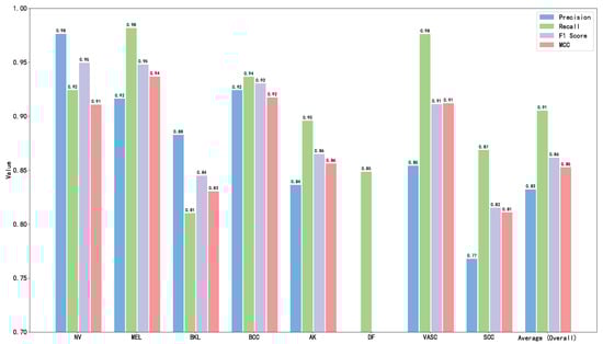 These results fully demonstrate that the model proposed in this study has excellent screening capabilities for malignant skin lesions. In clinical practice, a high recall rate can maximize the timely detection of malignant lesions, winning precious time for early intervention for patients and reducing the risk of delayed disease due to missed diagnosis. In addition, the stable performance of the model in different types of malignant lesions also provides solid data support and technical assurance for its clinical transformation and application in the field of early skin cancer diagnosis, and it is expected to become an effective auxiliary tool for dermatologists to quickly and accurately identify malignant esions.